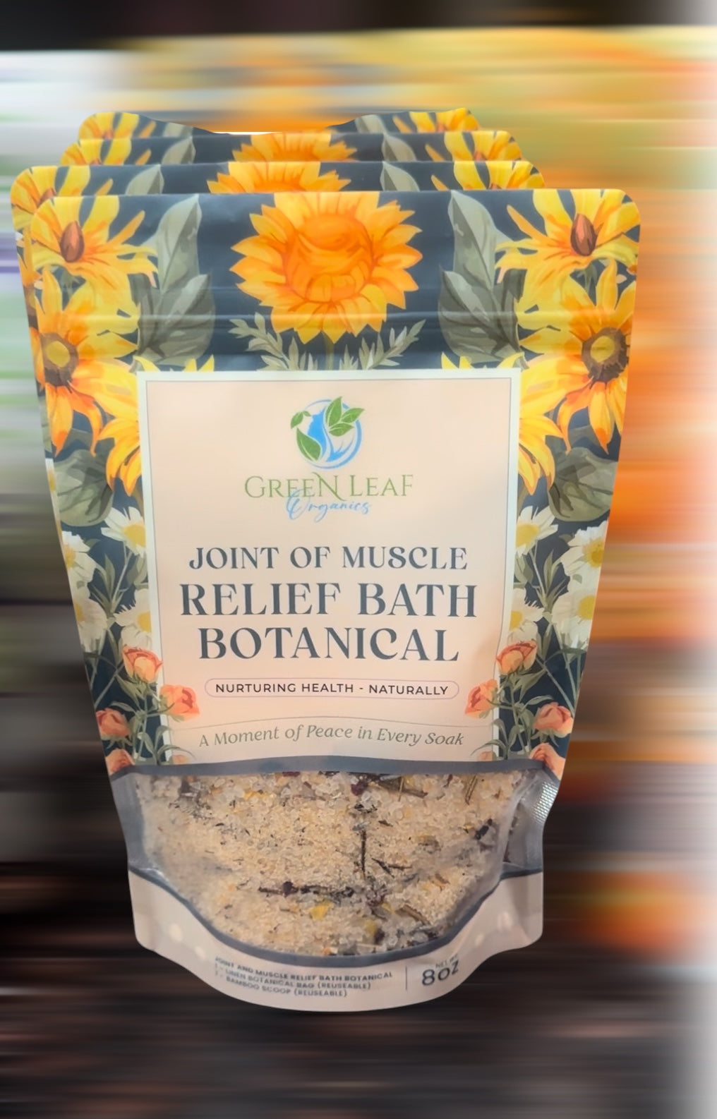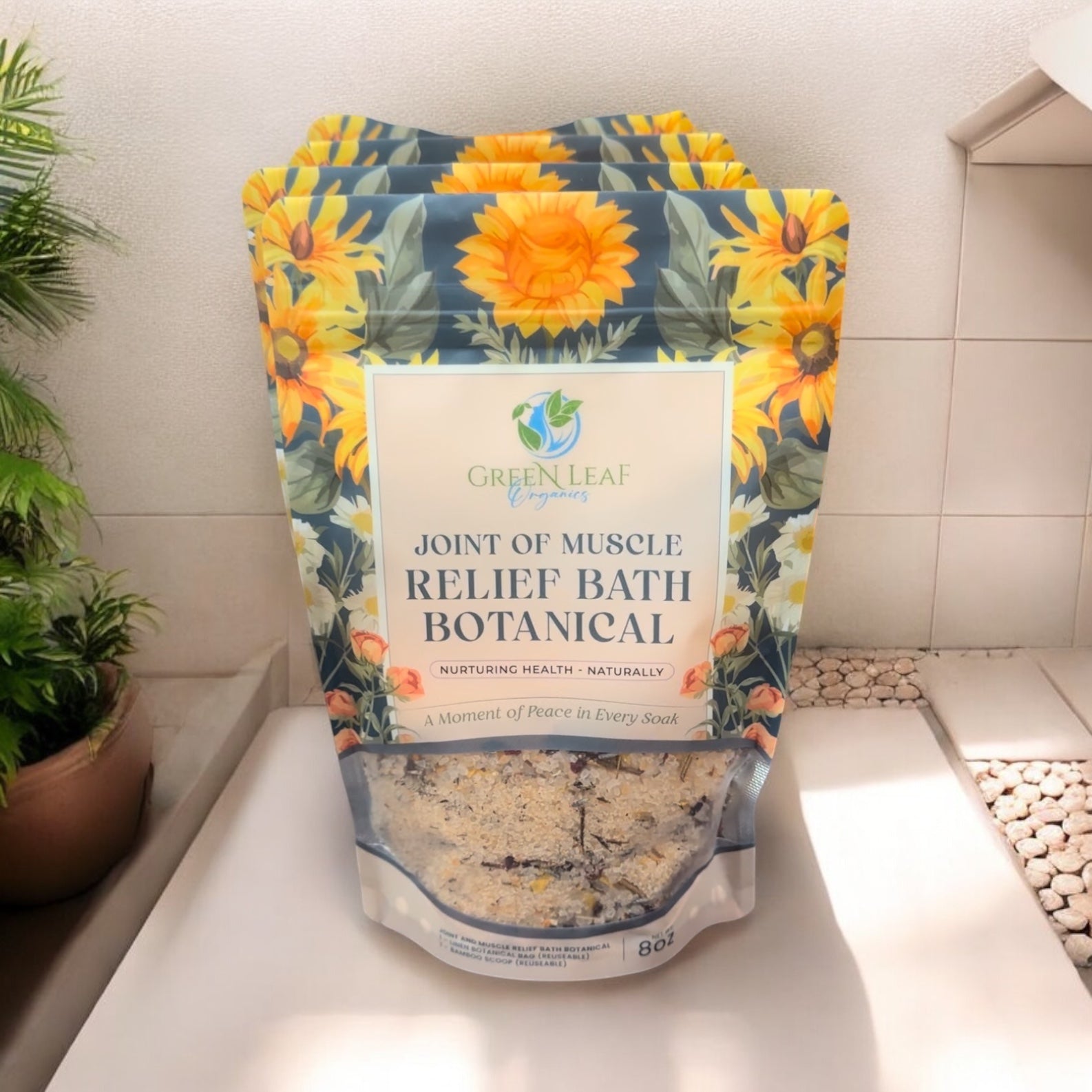 Each pouch contains 8 oz of bath botanical, 1 tea bag and 1 wood scoop.