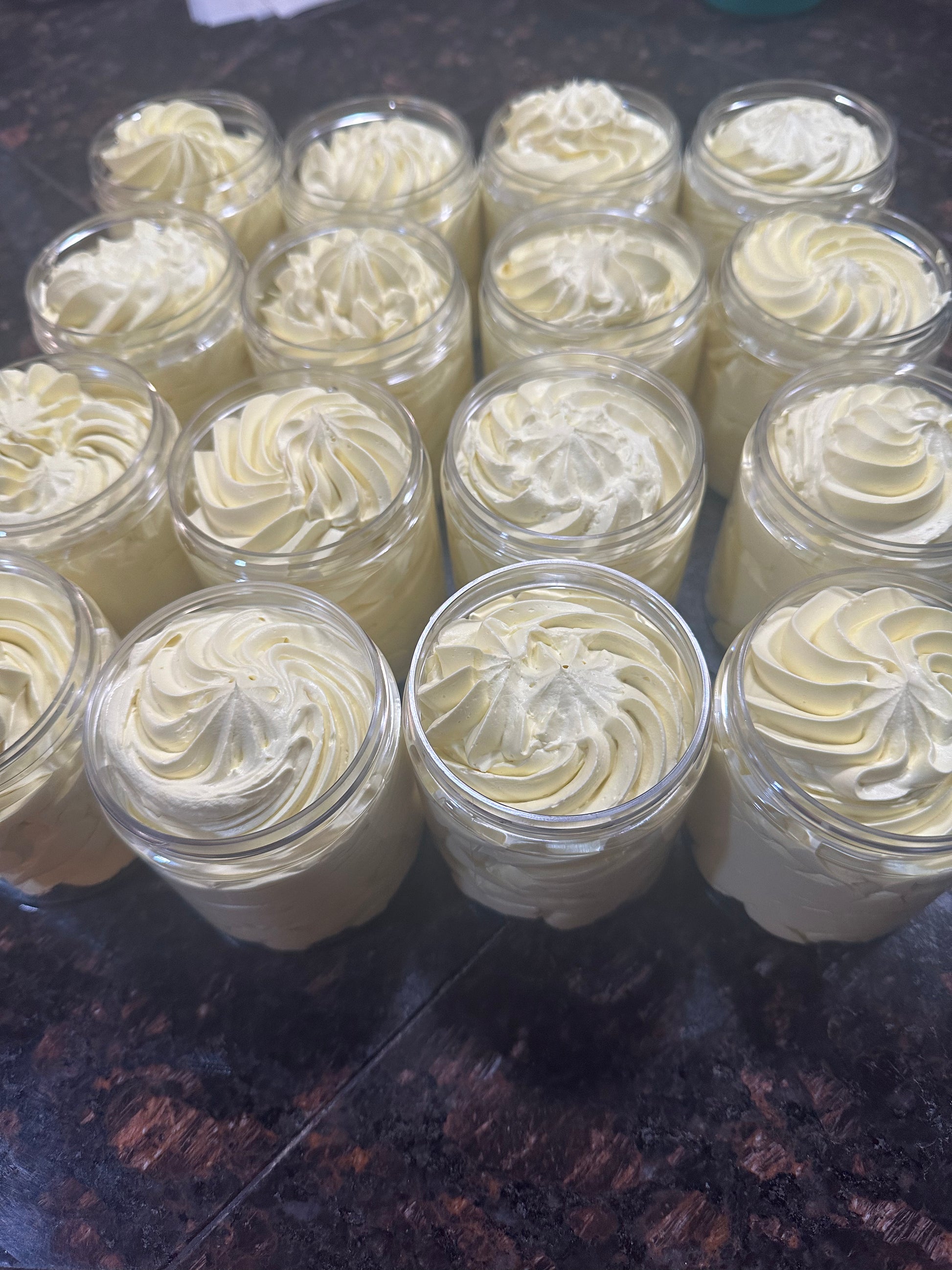 A luxurious fusion of organic Shea Butter, Mango Butter, and Coconut Oil, carefully crafted to caress your skin with velvety smoothness. Each dollop of this decadent butter is an infusion of pure indulgence, leaving your skin nourished and deeply moisturized.